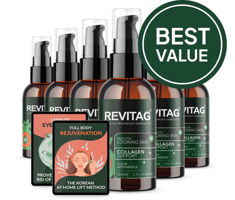 REVITAG pricing ranges from $69 for a single bottle to $294 for a six-bottle supply, with discounts and free shipping available for bulk purchases.