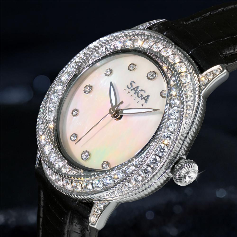 Thiết kế của mẫu Saga 53375-SVMWBK-2 được lấy cảm hứng từ khu vườn ban đêm yên ả. Viền đồng hồ đính đá Swarovski được sắp xếp khéo léo như cánh hoa bung nở. Mặt số xà cừ tỏa ánh ngọc ngà, tạo nên hình ảnh hồ nước phẳng lặng dưới ánh trăng.